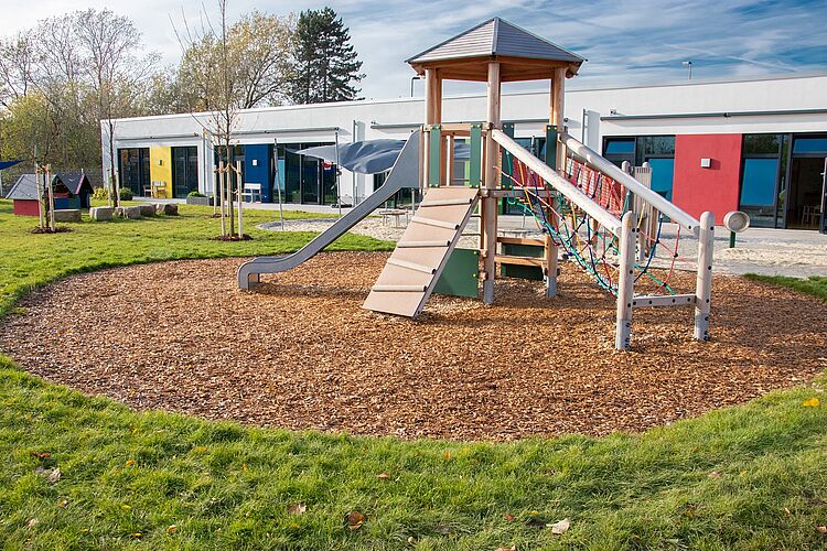Die Gruppen sind ebenerdig in modernen, hellen und großzügigen Räumen untergebracht. Zusätzlich zu den unterschiedlichen Gruppenräumen gibt es eine Küche, Leitungsbüro, Mehrzweckraum, Mitarbeiterraum, ein kleines Büro für Vorbereitungen und Beratungen und weitere Versorgungsräume.
