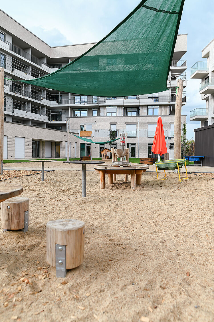 Das großzügige und attraktive Außengelände, bietet vielfältige Aktionsmöglichkeiten zum Schaukeln, Klettern, Rutschen, für Erfahrungen mit Wasser und zum Spielen. Hier haben die Kinder viele Möglichkeiten sich bei jedem Wetter frei zu entfalten und mit allen Sinnen die Natur inmitten von altem Baumbestand zu entdecken.