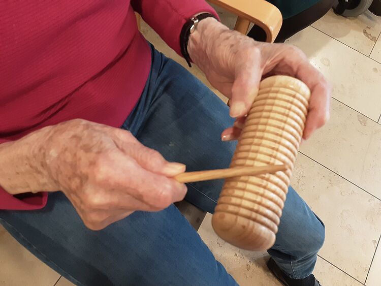 In der Gruppe „Fit mit 99 plus“ wird vor allem die Bewegung gefördert. Aber auch gemeinsames Musizieren, Rhythmusübungen und Klangexperimente stehen auf dem Kursplan. Dabei werden die Seniorinnen und Senioren motiviert, sich aktiv zu beteiligen, sich zu bewegen oder bewusst zuzuhören. Dies trägt nachweislich zur Steigerung des Wohlbefindens, zur Förderung der Konzentration und zur Stärkung des Gemeinschaftsgefühls bei. Die Angebote werden individuell angepasst, sodass auch Menschen mit starken kognitiven Einschränkungen aktiv teilhaben können. Beide Musikangebote finden wöchentlich statt und werden von vielen Teilnehmenden mit großer Freude besucht.